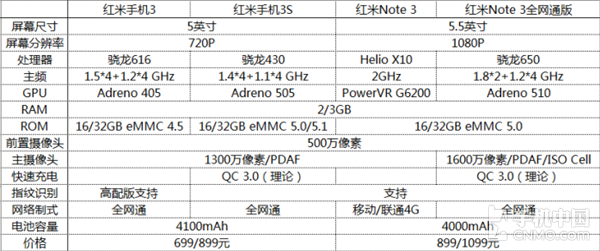 红米手机3高配版、红米手机3S、红米手机3标准版、红米Note 3