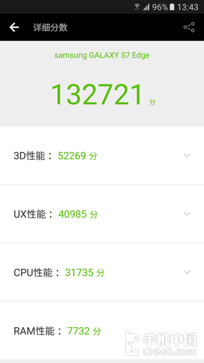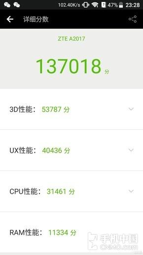 使用安兔兔进行跑分测试,中兴天机7得分137018,三星S7 edge的得分为132721,中兴天机7占据微弱优势。通过单项得分的对比来看,这个差距主要体验在RAM性能上,那么6GB RAM相比4GB RAM有啥优势呢?