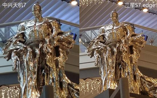 比如下面这张室内的雕塑样张,从100%细节对比可以感觉到,天机7对雕塑明暗部的处理要比S7 edge出色,特别是暗部的细节更丰富。