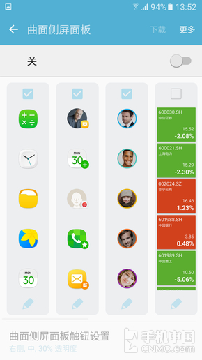 双曲面屏更多侧重于颜值,使用这种屏幕的手机确实好看,不过在功能方面乏善可陈,三星S7 edge的曲面侧屏可以放置众多的快捷方式和工具,也可以用来显示来自搜狐、日历和天气的信息,当来电时可以通过不同的色彩进行提醒,可以当作刻度尺、指 南针等等,但给我的感觉就是有了就用,没有也无所谓。