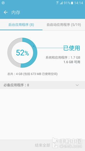 其实只需要对比下开机剩余RAM容量就好,中兴天机7的开机剩余RAM达到4.2GB,而三星S7 edge仅剩下1.6GB,差了接近3倍,在开始大量后台应用的时候,剩余RAM足够大能够保证手机的流畅性。