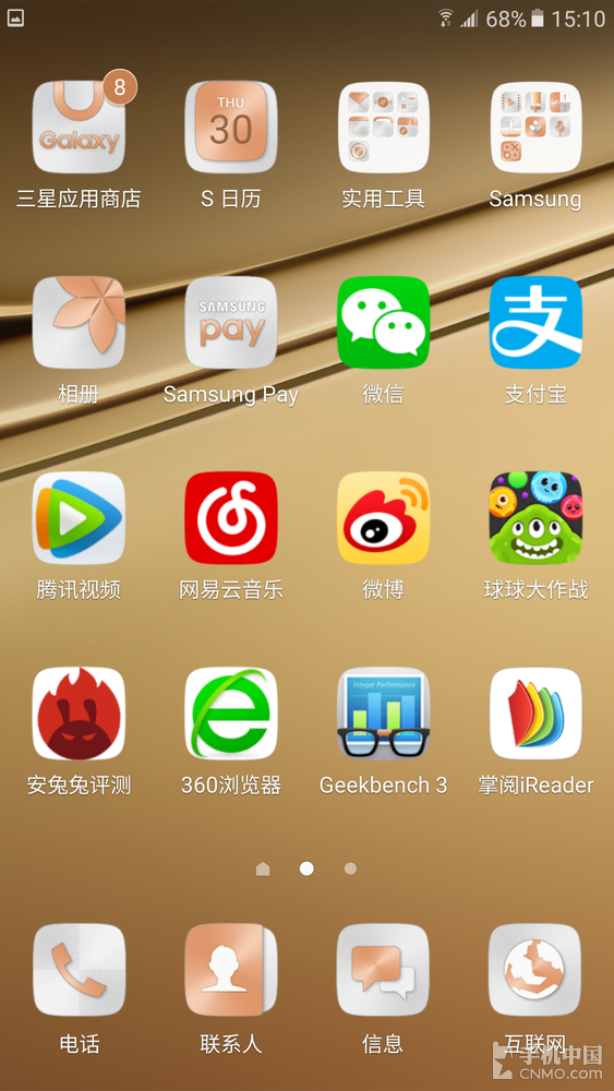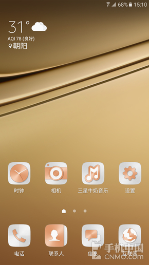 三星Galaxy C7拥有枫叶金、蔷薇粉、皎洁银和烟雨灰四种配色,我手里的是枫叶金,三星为每一种配色都专门设计了UI来搭配。下图中,典雅的金色机身和主打粉金色(我也不知道怎么叫,反正就是粉里透着金)的图标界面,取得了十分协调的视觉性。