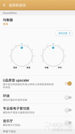 在音乐上,C7特别加入了U品原音的技术,这是一种高清音频还原技术,可以对在线及本地音乐进行实时的修复还原,提升音乐的分辨率以获得更佳的听觉体 验,我个人感觉开启后主要在人声的清晰度和杂音过滤上表现更出色。此外,如果对音效不那么满意,也可以根据自己的听力特征来定制音质优化方案。