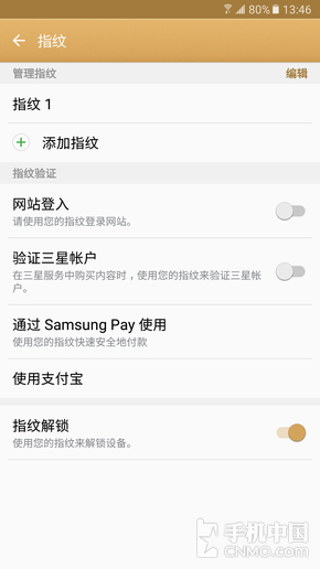 在指纹功能上,三星Galaxy C7并没有太多花里胡哨的东西,主要可以应用于支付宝和Samsung Pay。支付宝不用我解释了吧,很多国产手机的指纹功能也都连接到了支付宝和微信。而Samsung Pay就不一样了,这又是三星的实力体现。