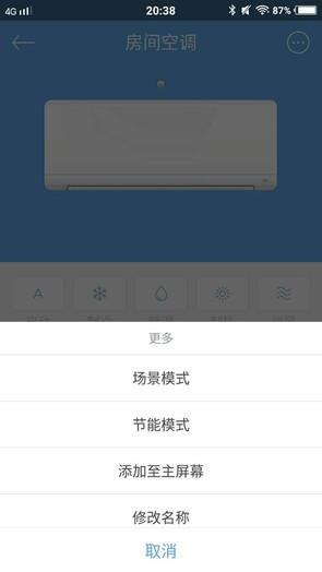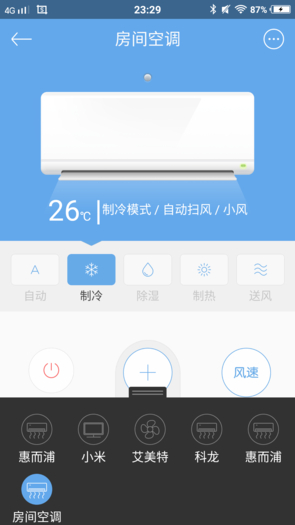 以下是空调的遥控界面,除了有自动模式外,还有制冷、除湿、制热、送风等模式,同时用户可以从屏幕底部向上滑动呼出不同设备的快速切换栏。