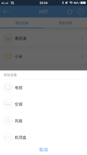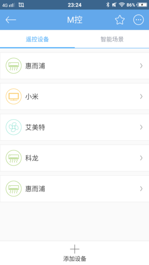 打开“魅家”App,手机靠近智能遥控器,然后就可以搜索并成功连接(由于目前“魅家”App对iOS10测试版存在兼容性问题,因此以下使用安卓系统 来介绍说明),用户可对设备进行重命名(本文使用默认名称“M控”)。完成后点击进入遥控设备的管理界面,点击下方的“添加设备”,选择相应的设备种类以 及品牌,按照提示操作便可轻松找到与设备相应的遥控器方案。