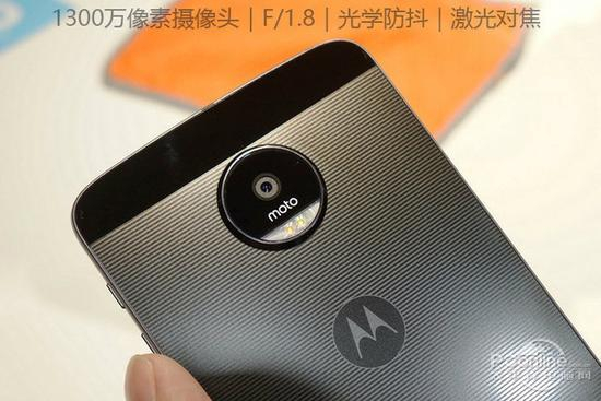 Moto Z的主摄像头规格为1300万像素、单位像素1.12微米;配备F/2.2光圈,具备光学防抖机构,支持激光对焦和反差对焦。相机模组、补光灯集成在一个凸起的“奥利奥”结构里。