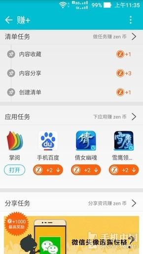 “短信+”可以将用户的话费账单、航班动态、优惠提醒等七大类常见服务类场景短信自动生成卡片,让用户对重要信息一目了然;“赚+”让用户可以通过签到、下载APP、浏览网页、在线游戏等赚取Zen币,Zen币可以在商城中直接兑换多达300种商品,让用户在玩手机的过程中不知不觉就能“赚钱”。