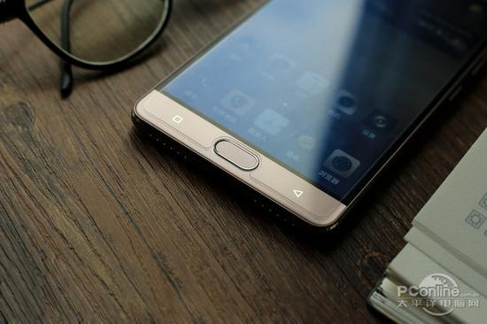 在金立M6的下巴部位,我们可以看到整合了指纹识别功能的物理home键,以及触摸式的程序管理与返回按键,而底部中央位置为Micro USB接口,左右两侧为对称网孔。