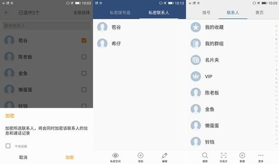 以私密联系人为例,只要将通讯录中的指定联系人加密,只有在进入私密空间后才能查看到相应的联系人,而普通的通讯录中是找不到加密联系人的。与此同时,被加密联系人的信息和通话记录也会被加密,同样只能通过私密空间查看。