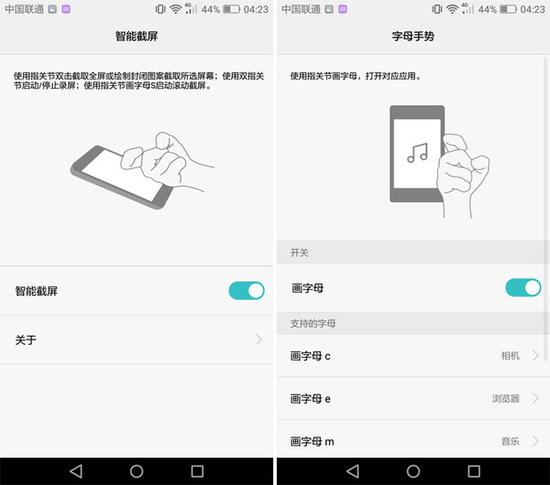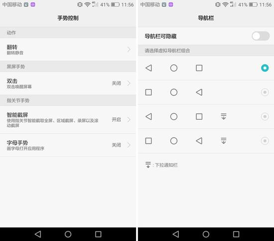 此外,EMUI4.1支持一系列的自定义功能,导航栏的返回键和多任务键的位置可以改变,还能够通过指关节双击屏幕进行截图、录屏与打开应用等操作。