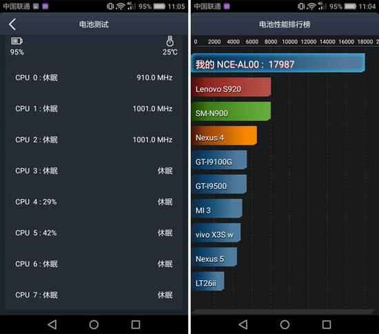 CPU会根据运行负荷自动调节频率或关闭核心,通过安兔兔续航测试见到,华为畅享6的续航还是比较优秀的。另外一个省电的因素就是华为畅享6采用了AMOLED屏幕,由于其自发光的特性,显示黑色区域多的图像时,屏幕耗电量更低。