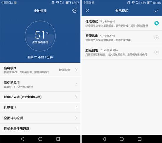 EMUI4.1支持智电4.0技术,在这项技术下,为续航带来更大的保障。系统提供了三种省电模式,分别是性能省电、智能省电以及超级省电模式。