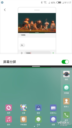 nubia UI M2定制版还内置了分屏模式,顾名思义把屏幕一分为二,每屏可以独立运行,特别适合边看视频边回微信,不用每次切换来切换。需要注意的是,并不是每个应用都支持分屏模式,除了系统自带的应用外,微信、QQ、优酷等第三方大型应用都是支持的。