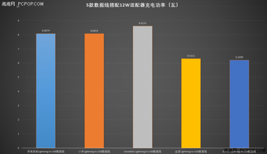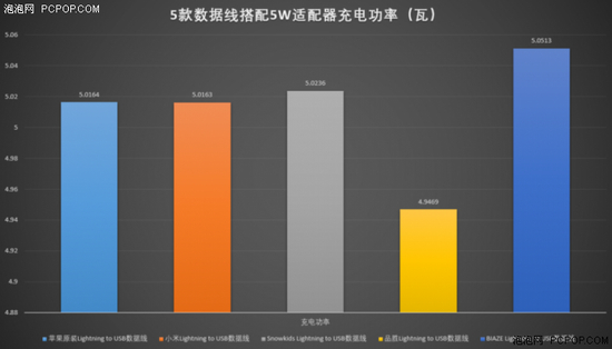 通过以上iPhone原装充电功率对比测试可以看出,五款Lightning to USB数据线都能达到或接近iPhone原装充电器的5W额定功率,毕竟目前5V/1A的充电功率已经是非常低的充电标准了(入门级),因此即使是售价9.9元非MFi认证的BIAZE数据线都能达到额定功率,即使是品胜的约4.95W的充电功率也与最高的5.05W相差并不大,因此可以看出,用原装充电头给iPhone充电时由于电流电压都较低因此这5款数据线都能满足需求,充电功率的微小差距可以忽略。