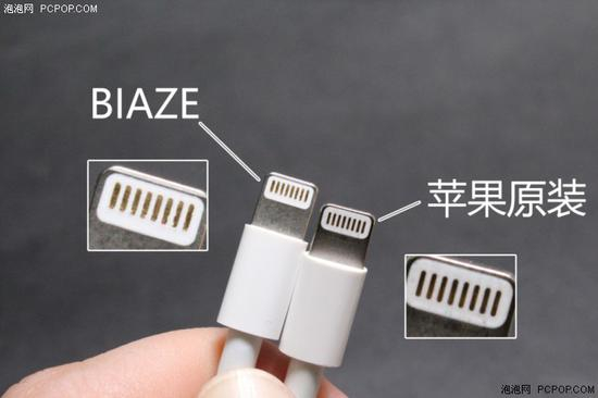 而BIAZE虽然线体包装方面没有什么问题,不过在材质手感上确实有些欠缺,有一种为了做到和原装线类似手感而特意打磨的感觉。而且在接口方面的做工确实比较粗糙,在手机接口一端可以看出来有明显的金属条缺失情况,在使用中可能会有隐患。