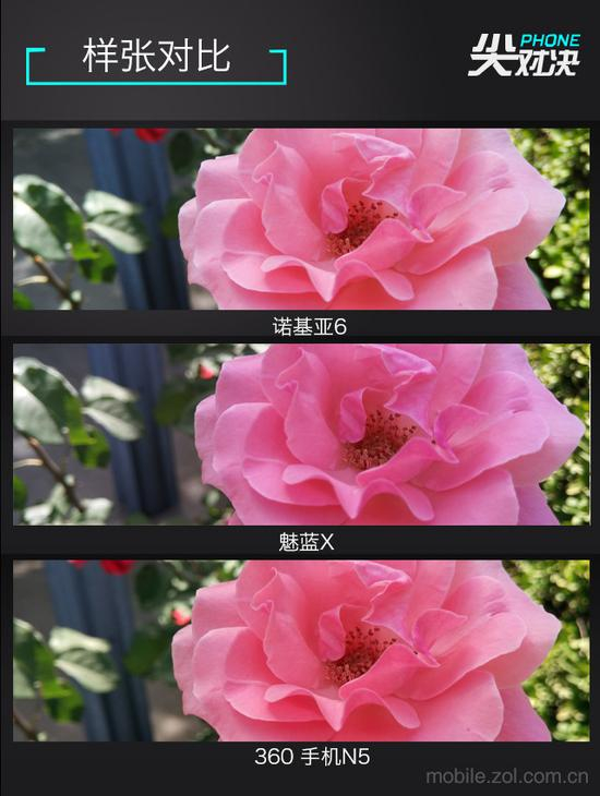 360 手机N5拍出的花朵颜色最接近真实,诺基亚6有些偏淡,魅蓝X有些偏艳。