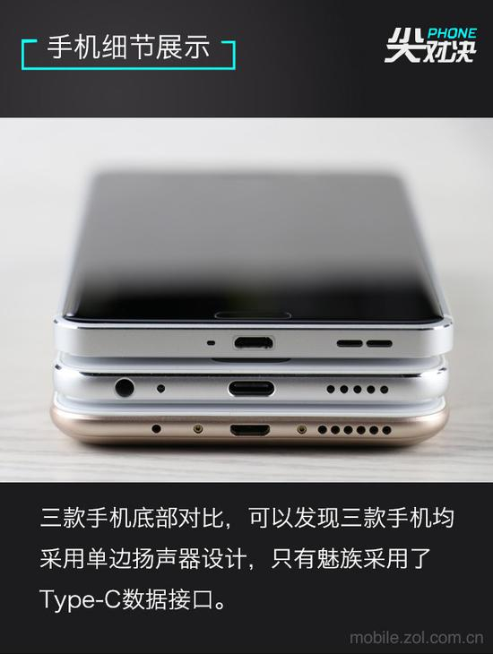 在机身底部,三款手机均采用单边扬声器设计,魅蓝X采用了Type-C数据接口。这样的底部设计很难客观地去评价好坏。魅蓝X的底部设计最符合笔者的审美,这种直线与弧线的搭配让手机显得既不过于硬朗,也不过于圆滑,相对对称的造型也让手机外形独具设计美感。