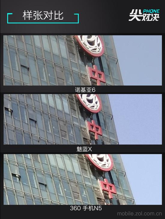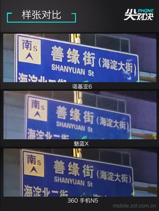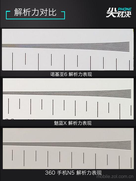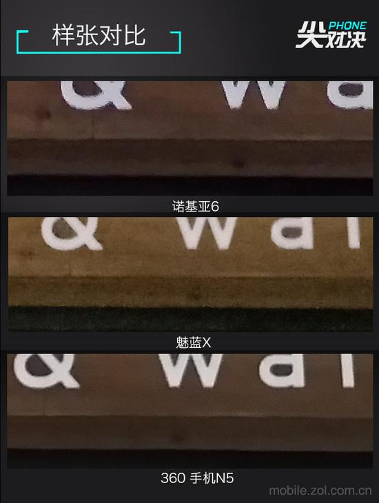 可以很容易得看出,诺基亚6的解析力最好,魅蓝X次之,360 手机N5最差。