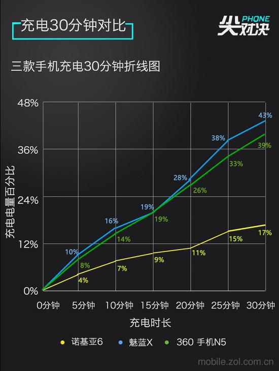 30分钟充电魅蓝X最快,电量达到43%,360 手机N5次之,充了39%,诺基亚6最慢,只充了17%。在续航测试中,360 手机N5最坚挺,测试结束后剩余75%电量,魅蓝X与之差距不大,剩余74%,诺基亚6耗电最快,剩余64%的电量。