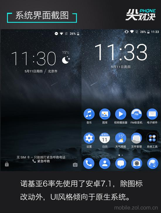 从系统界面来看这款手机的UI可以用“极简”来形容,系统主要以蓝色为主题样式,系统首页为自带App,底部duck栏为电话、联系人、短信、相机、互联网等常用App。可以从系统信息设置界面中看到已经升级到安卓最新7.1.1版本,官方每月都会进行安全补丁系统更新。