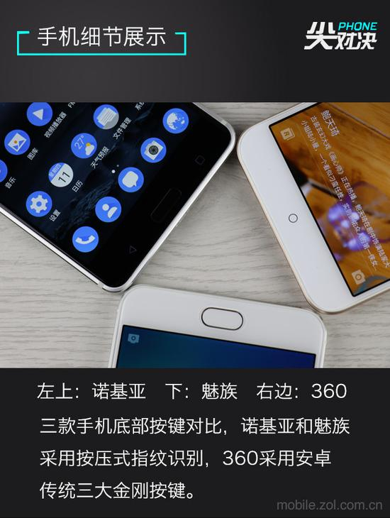 诺基亚6和魅蓝X都采用了正面指纹识别,但也各有不同。诺基亚6的指纹识别按键固定不可按下,并且在其左右保留了返回键和多任务键,魅蓝X则是采用了魅族自家的mback方案,指纹识别按键可按压,并支持一系列交互命令。360 手机N5的指纹方案相对古老,采用的是背部指纹识别,正面设置安卓传统三大金刚按键。