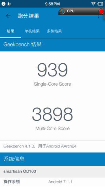理论测试环节:GeekBench,单核跑分939,多核跑分3898,虽然算不上多高,但又不是不能用。在平时应用的系统流畅度方面不必担心。不过由于骁龙625并不支持UFS闪存,因此坚果Pro闪存采用eMMC,不过通过实际跑分来看,应该是eMMC 5.1,通过询问,证实坚果Pro的内存配置为LPDDR3+eMMC 5.1,这在 因此在实际体验上也并不会差多少。