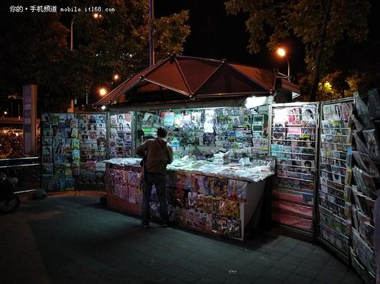 夜拍方面,坚果Pro的成片速度较慢,从效果来看画面亮度尚可,噪点有所收敛,但是画面的涂抹感略重。以报刊亭的书籍为例,基本已经糊成一片分辨不清。并且动辄1/20s、1/15s的快门速度很考验拍摄者手持的稳定性,影响成片率。