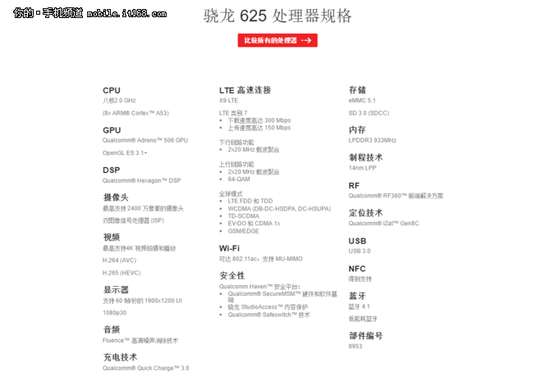 骁龙625处理器定位中端,由8核心Cortex-A53架构组成,采用先进的14nm FinFET工艺打造。Cortex-A53架构的特点就在于能效高、面积小,因此常被冠以“节能小核”的名号。此番高通更是选择了14nm的制程,使得处理器会更省电、发热也更小,从而A53核心的主频可以稳定维持在较高的2.0GHz,不会因为过热而降频,保证了足够性能。除了在处理器设计、工艺上下功夫,高通还有更多专业技术进一步降低功耗。比如在GPU中加入UBWC(通用带宽压缩技术),意在以更低的功率实现更真实的场景和物体渲染。从原理上,带宽压缩技术可以做到在传输同样大小数据时所用带宽更小,因此运算量更高,获得画面的细节也就更多更细腻。在实际应用中,可以在GPU运算时减少不必要的功耗,达到更加省电的目的。因此,你才会看到老罗的那句:让快充无用武之地。