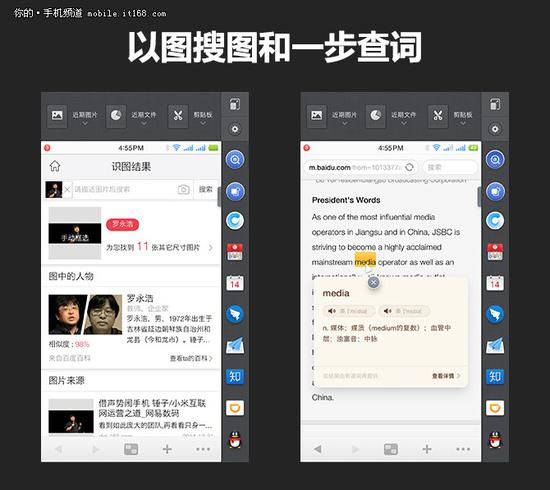 在开启了One Step的前提下,当用户在图库中选择一张图片,并将其按住,便可拖动到右侧的“图片搜索”的按钮上,松开后便会在浏览器中搜索出图片中的事物或人物。它如果是商品便会链接到购买入口;若是人物则会列出这个人物的介绍和生平。