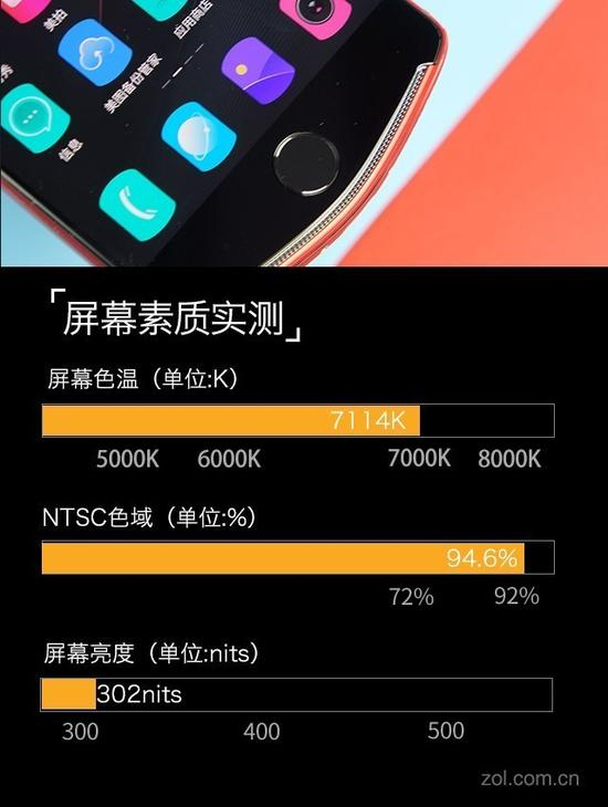 通过测试可以看出,美图T8s的这款屏幕表现还是十分不错的。94.6%的色彩表现发色丰富,颜色浓郁。7114K的色温虽然偏冷但是也比较准确。唯一遗憾的就是受限于AMOLED材质导致屏幕的亮度不是很高。