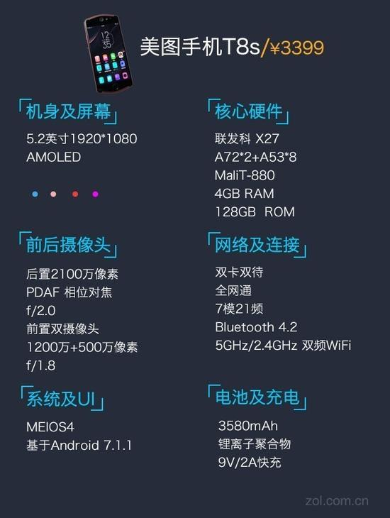 同时美图T8s还有一颗500万像素的前置副摄像头。自主研发的电影模式融合双摄带来的极智虚化与光斑效果,让你的照片犹如电影画面般唯美。