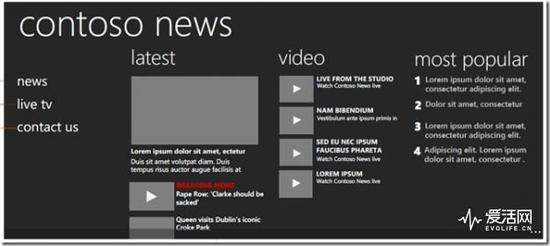 这一设计的有点在于统一以及低廉的学习成本,微软希望信息在Windows Phone中通过Metro界面能够简洁清晰、快速的、并以内容为主的方式进行展现。以此为基础,微软在第一个版本中设计了People、Music&Video、Picture、Games、Marketplace和Office六个不同的组件,这些组件以全景视图的方式在平面上水平切换,它首次提供了一种全新的视图,在水平方向上扩展内容到屏幕之外,来展现不同的控件、数据和服务,就好像把它们排布在一张横轴的画卷上。通过这一系列规范,早期Windows Phone的应用程序不仅在UI上取得了统一,更在交互上以滑动做到了一致,用户在使用符合Metro规范的应用时几乎不在需要花费过多的学习成本,统一的Application Bar几乎已经完成了直觉式交互的目的。