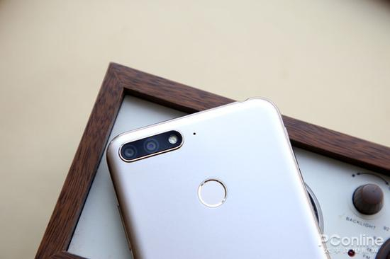 华为畅享8e的背面为哑光效果的塑料,在顶部的双摄、指纹识别区域同样以MVCM镀膜包围。整体的手感相当不错。