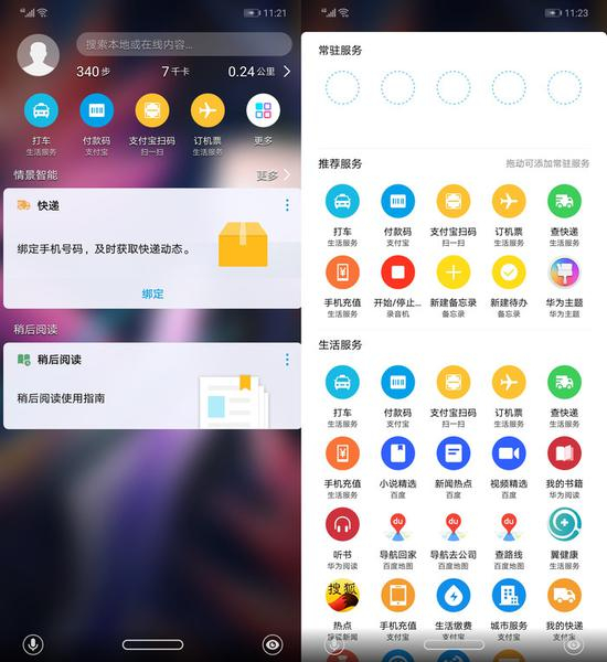 随着华为在AI功能的发力,智能的AI体验已经成为EMUI不得不说的卖点。常见的负一屏设计就已经集成相当丰富的功能,例如一键导航、开启付款码等支持直接跳转到第三方应用功能的便捷操作。根据用户当前的使用状态,还有会提醒天气、手机使用时间的情景智能卡片,做到提前预测用户所需。