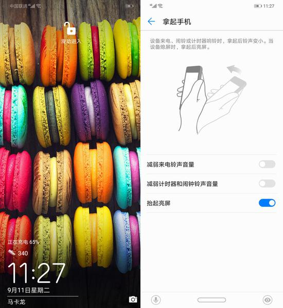 在开启人面解锁的抬起亮屏时,我们还发现EMUI相当人性化的一个细节,拿起手机的同时可以减弱来电音量和闹钟音量。因为当我们拿起手机的时候,这些声音提醒的作用已经起到了,继续播放反而显得更吵,而减弱音量的设定,就考虑得非常周到。