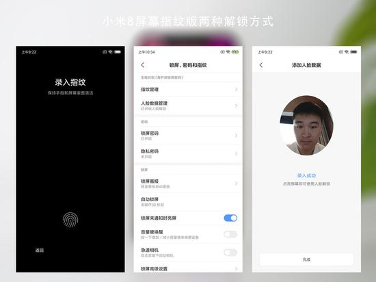 和标准版的小米8相比,小米8屏幕指纹版另一个大的改进就是解锁方式的变化——除了红外人脸解锁之外,还将后置指纹识别换成了屏下指纹,一方面提高了手机的颜值,另一方面则更加符合正面指纹用户的需求。