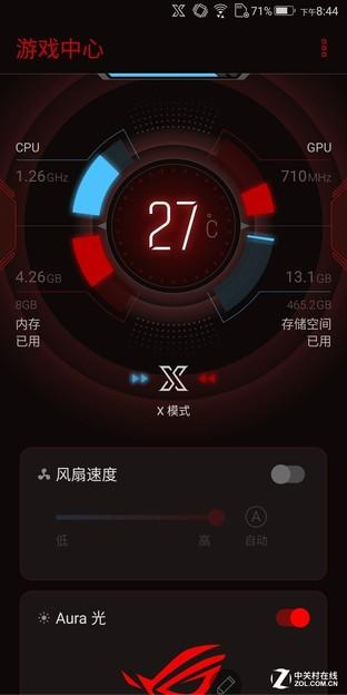 在X模式开启后,ROG 游戏手机背面的ROG Logo也会进入X模式灯效,系统会自动管理程序,优化后台内存,调整CPU频率,使高频的骁龙845发挥出最大的性能。