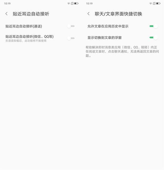 还有其他一些很实用的功能,比如手机贴到耳边自动接听和在聊天/文章界面快捷切换,都是提高平常玩手机效率的小功能。