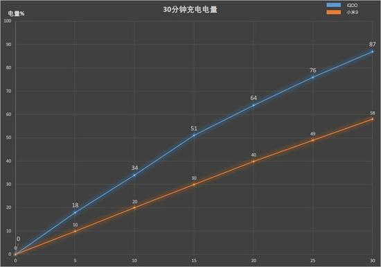 在拥有着4000mAh大容量电池的情况下,iQOO依靠vivo Super Flash Charge仍然在半小时内充到87%,“电量焦虑症”这下有福了;而小米9只有58%的电量。从曲线图上可以看出,在更有限的充电环境下,iQOO的44W快充更具优势,比如充电10分钟,即可获得XX%的电量,随充随走,而小米9则不具备此优势。