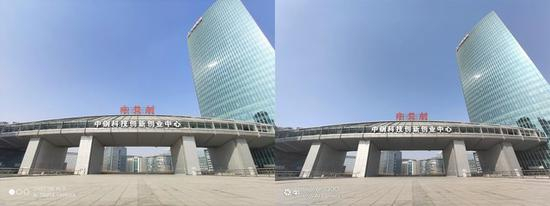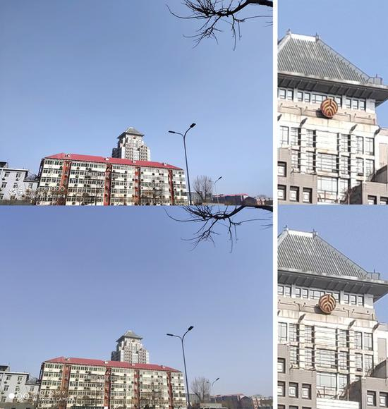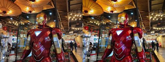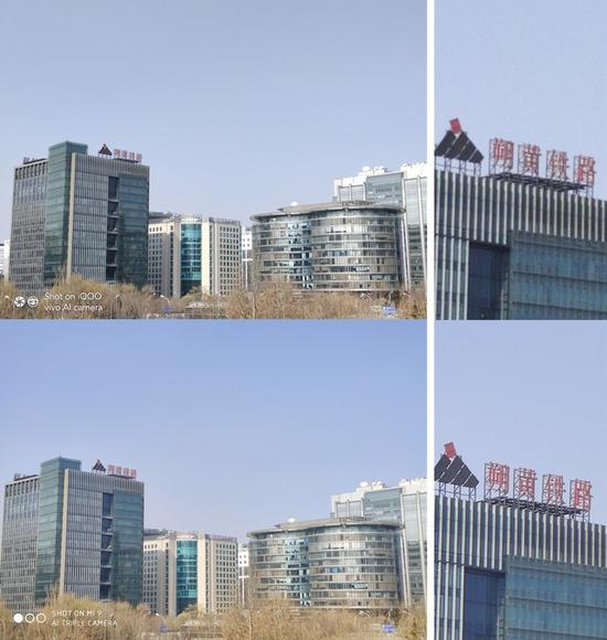 从超广角仰样张来看,iQOO的度数要大于小米9,表现上更加趋向于鱼眼头。不过在暗部细节上,iQOO还有优化的空间,后期在算法上进行改善。