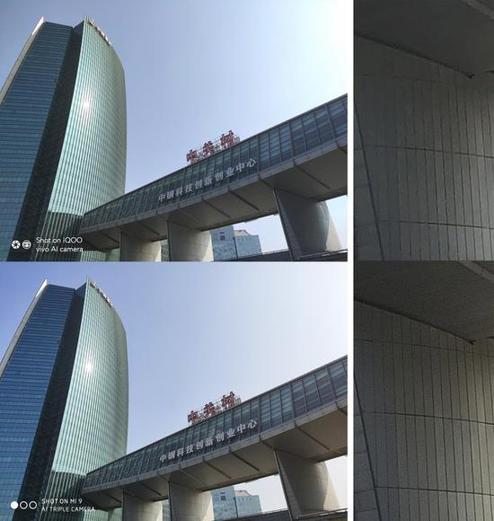 在样张对比中,两者的调色风格并没有形成太大差异,整体风格粗看下比较相近。但缩放之后,你可以发现搭载了IMX 586的小米9在细节上要更加丰富,而iQOO的在高光处已经丢失了部分墙体纹理。
