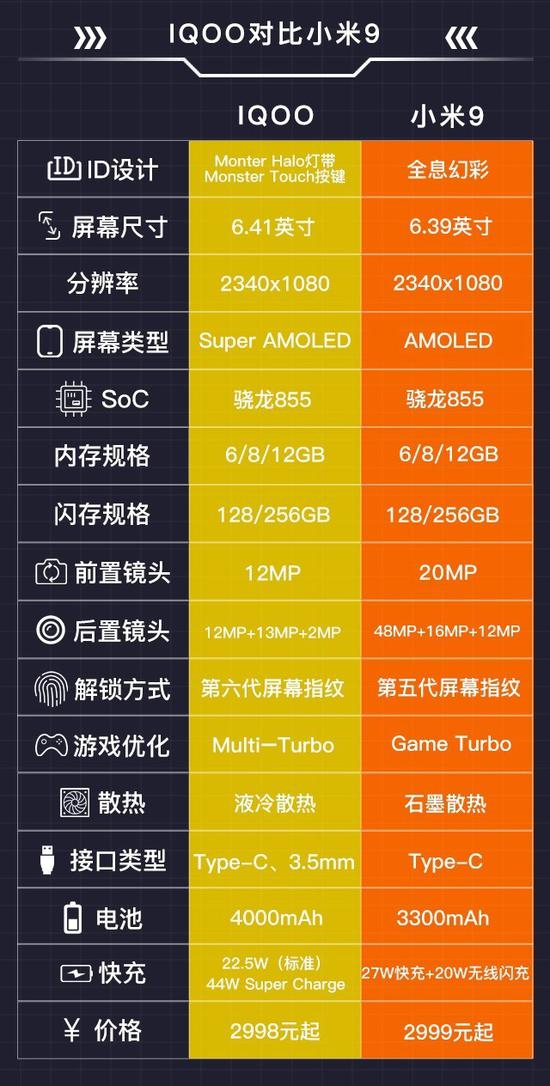这次《尖Phone对决》遴选的配置也颇具看点,8+128GB的小米9售价为3299元,8+128GB的iQOO也是中配,不过3298元的售价同样比小米9少出一块钱,光是售价就能瞬间引起浓浓的火药味。剑拔弩张的紫禁之巅对决谁能取胜,列位看官且往下看。