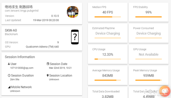 最后测试的一款便是时下十分热门吃鸡类游戏,打开游戏后可以看见画面设置为HDR高清,帧数设置为超高。相较于前两款游戏《刺激战场》对于黑鲨游戏手机2的考验更加大,本次测试《刺激战场》运行了27分钟,通过Gamebench测试帧率保持在了40帧且十分稳定,但在游戏运行二十分钟之后能明显感受到背板的发热,而这也是由于黑鲨游戏手机2在背面采用了金属材料以及铜管散热,这样能够更快的将热量导出但背部发热的感受也更为明显。