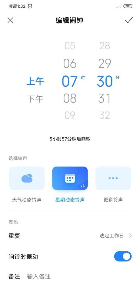 而除了视觉方面的变化外,MIUI 11在声音系统上也有不小的升级。此前在MIUI 10上,小米推出了“自然动态声音系统”,这套系统通过不同听感的声音,让手机变得更具个性。MIUI 11中新增了全新的“动态闹钟”功能,系统会根据不同的天气或不同的日期,来动态调整闹钟铃声,避免长期听到同一个闹钟声音导致免疫。