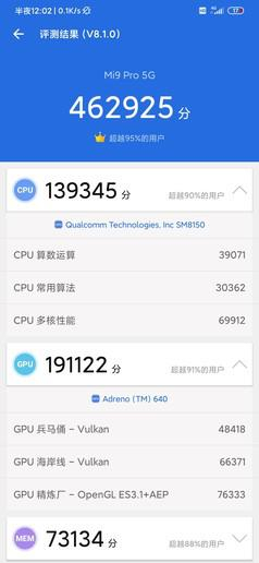 小米9 Pro 5G跑分成绩为462925分