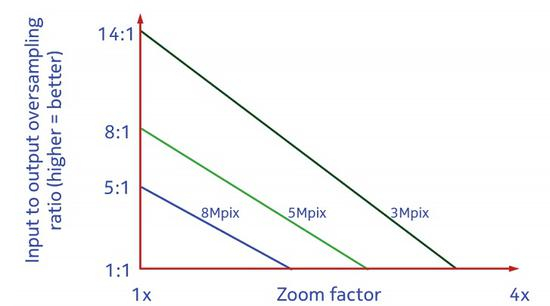 这对于无损数字变焦至关重要,这也是诺基亚808 PureView另一项超前的功能。在不使用变焦的情况下,诺基亚808 PureView将7个传感器像素合成一个图像像素,得到一张500万像素的照片;当你开始变焦,越来越少的像素会一直合并到1:1,即整个传感器的5MP裁切效果。