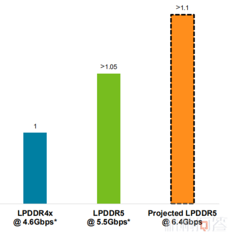 先说LPDDR5。LPDDR5采用全新的Bank Group架构,增加更多的并行数据通路,相当于给马路加了更多的车道,以此提升数据传输带宽。从数据层面可以看到其优势,LPDDR5的数据传输速率从LPDDR4X的4266Mbps提升至5500Mbps,传输带宽从34GB/s提升到了44GB/s。更快更强的同时,LPDDR5的功耗还降低了20%以上,这令手机续航时间能够最高提高10%以上。