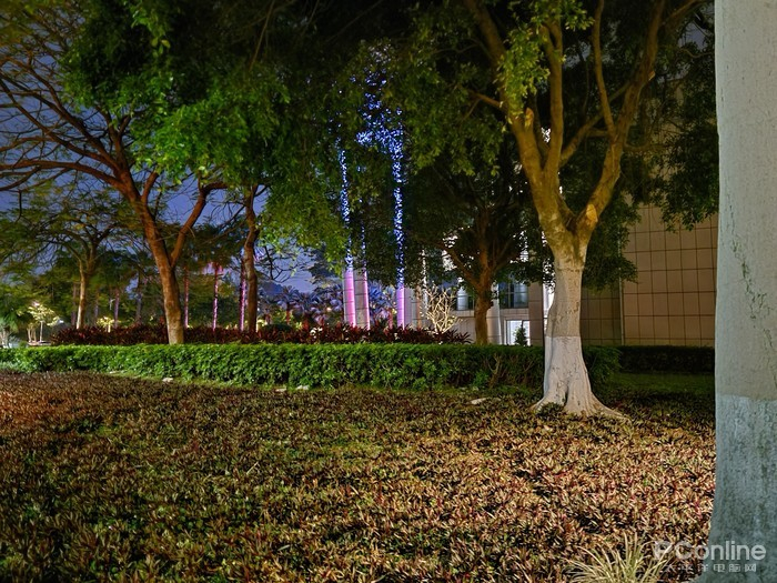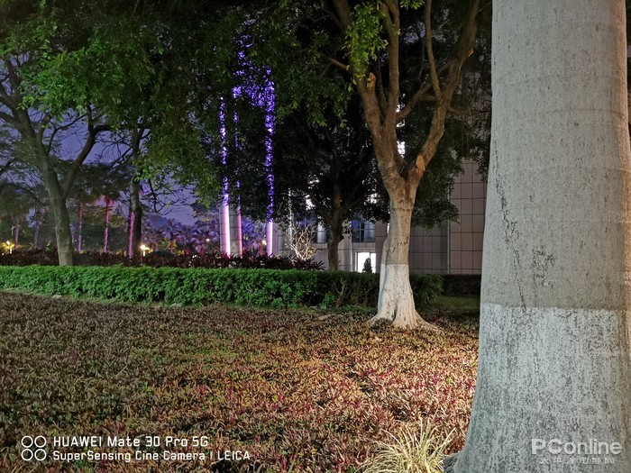 给华为和三星开启超级夜景模式之后,开始神仙打架了。两者的画面亮度相当,观感都十分好,但三星Galaxy S20 Ultra无疑有着更好的暗部细节,画面中心的远处树叶还有很高的可见度,左边更远处的几棵树同样如此。