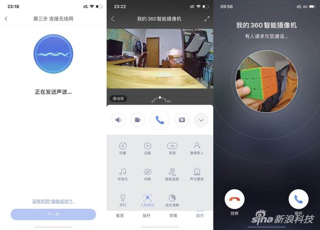 在登陆360账号之后,就可以进行设备的连接绑定了。有趣的是,360智能摄像机是通过声波进行连接的,在输入必要的WIFI信息之后,手机会发出特定的声响,放到摄像机旁边,就能够很快的进行连接。